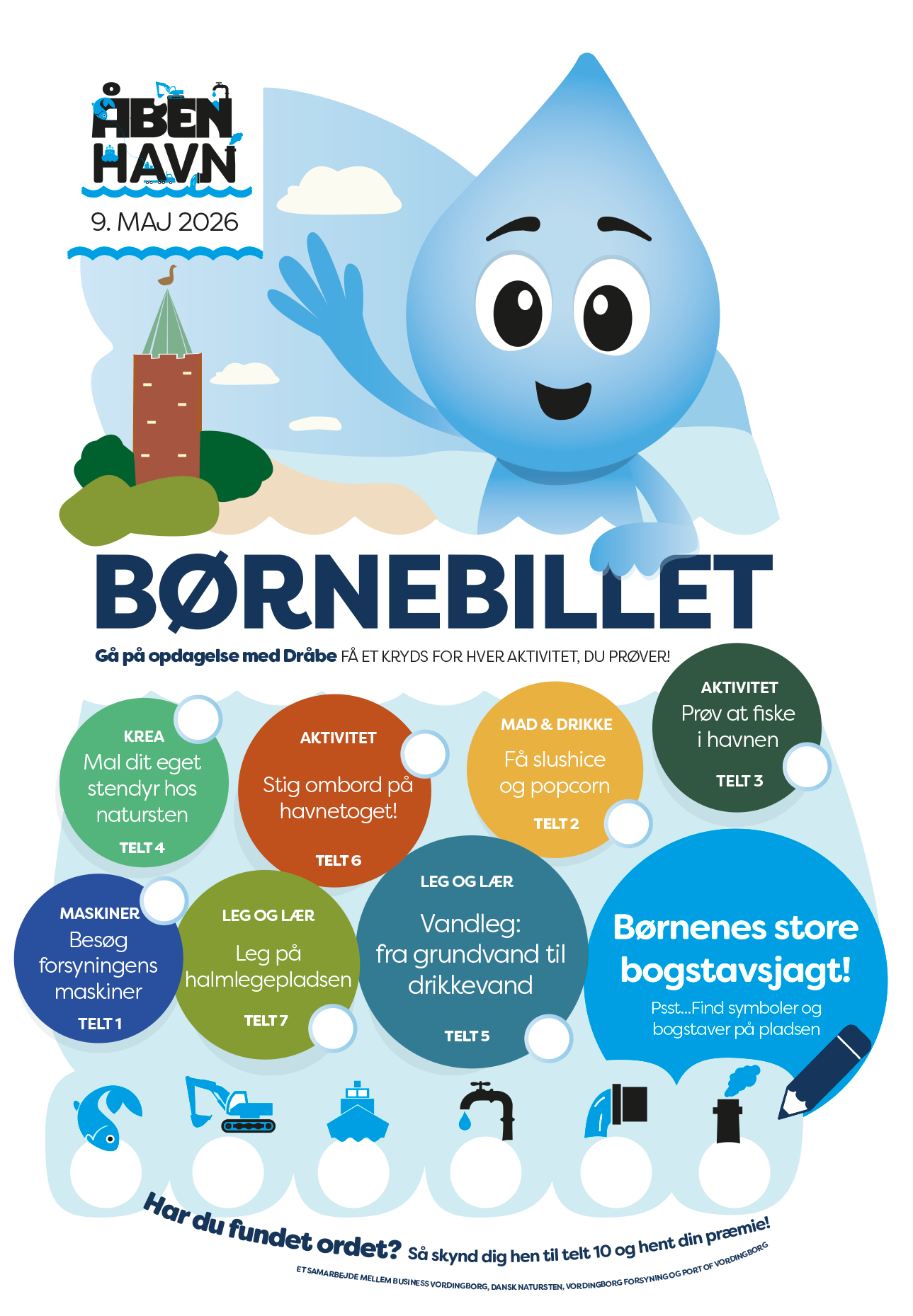 Så er I klar til en skattejagt mellem kraner, skibe og værksteder! Saml bogstaver og krydser undervejs, og aflever billetten ved telt X for at hente jeres præmie.
